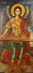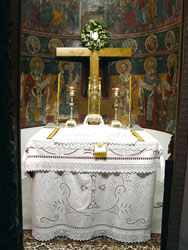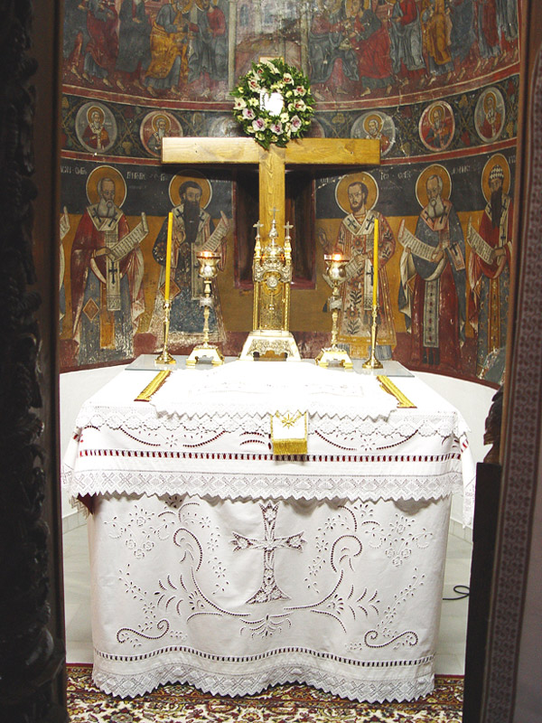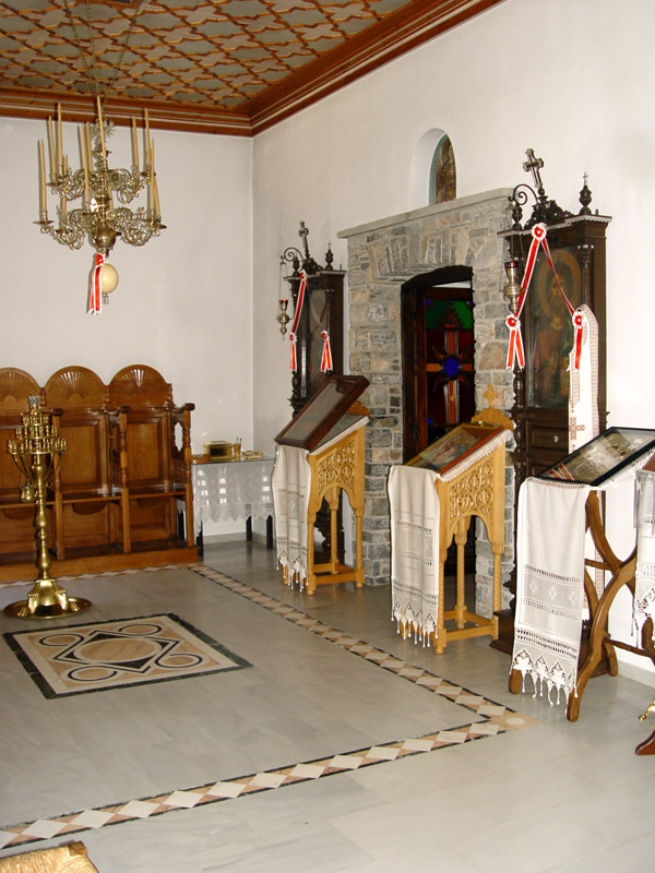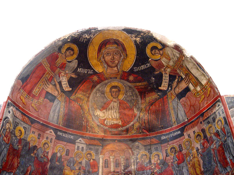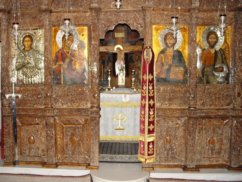 Χαρακτηριστικές είναι οι τοιχογραφίες του Ιερού Βήματος, όπως της Μεταδόσεως των Αποστόλων, Αγίων Ιεραρχών ολόσωμες και άλλων Αγίων σε στηθάρια, σκηνών από την ζωή και τα θαύματα του Κυρίου, ιδιαιτέρως δε της ωραιότατης Πλατυτέρας, που δεσπόζει στην κεντρική κόγχη με το ιλαρό πρόσωπο και τα μεγάλα Της μάτια.