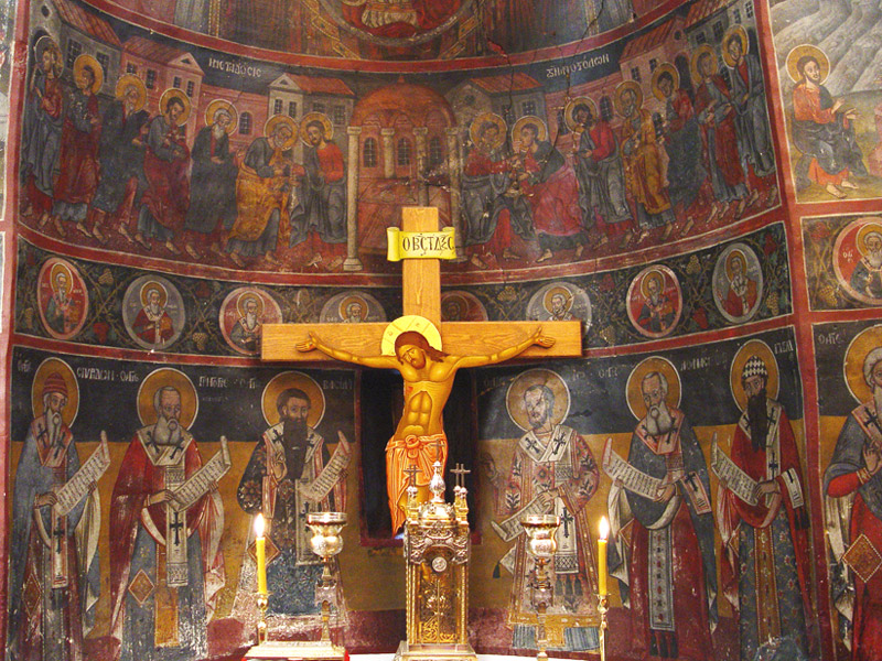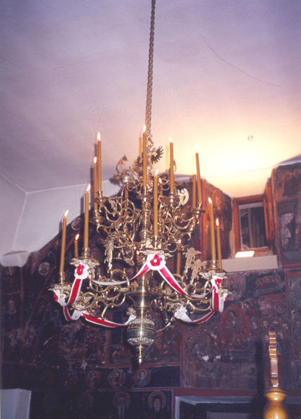 Τέλος, η Σταύρωση και οι εκατέρωθεν αυτής παραστάσεις της Θεοτόκου και του Αγ. Ιωάννου του Θεολόγου, τα λεγόμενα «λυπητερά», που βρίσκονταν στην κορυφή του τέμπλου, αφαιρέθηκαν, μη χωρώντας πια κάτω από την δίρριχτη στέγη. Περιμένουν, όμως, μέχρι σήμερα την αποκατάσταση του τρούλου, για να καταλάβουν και πάλι την πρώτη τους θέση.